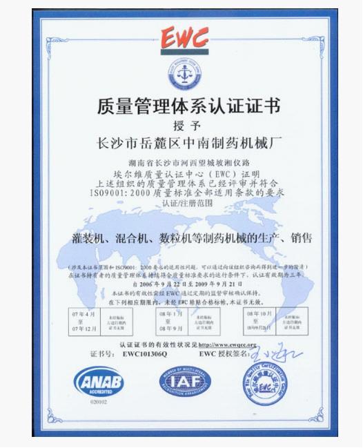 經(jīng)過3年的努力,我廠認(rèn)真按國際6S規(guī)范辦事,終結(jié)碩果。2006年9月,EWC國際認(rèn)證中心對我廠全方位嚴(yán)格評審,一舉通過ISO9001:2000質(zhì)量標(biāo)準(zhǔn)全部適用條款。該證書的取得,標(biāo)志著我廠全面質(zhì)量管理從此躍上了一個嶄新的臺階,也為我廠產(chǎn)品走向世界鋪出了一條綠色通道。