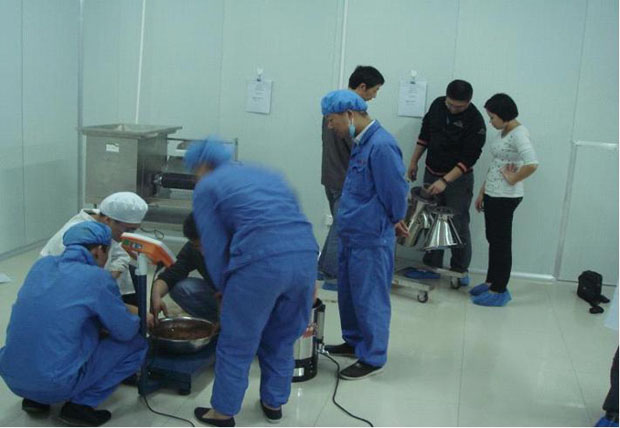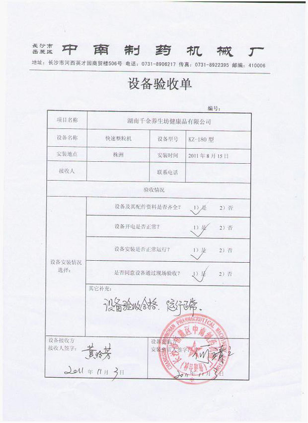 2011年10月,千金養生坊健康品有限公司向我廠購買了KZ-180型快速整粒機、ZKB-K型顆粒包裝機、DZ-60型全自動制丸機、LM型煉蜜機、RXH-48盤熱循環烘箱、CH-200型混合機、YK-160型重型顆粒機、GF-30B型帶除塵渦輪自冷式粉碎機組等設備。現已投入使用。