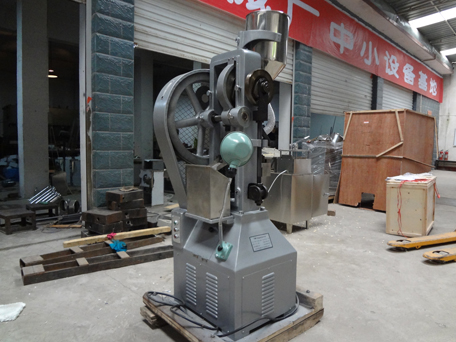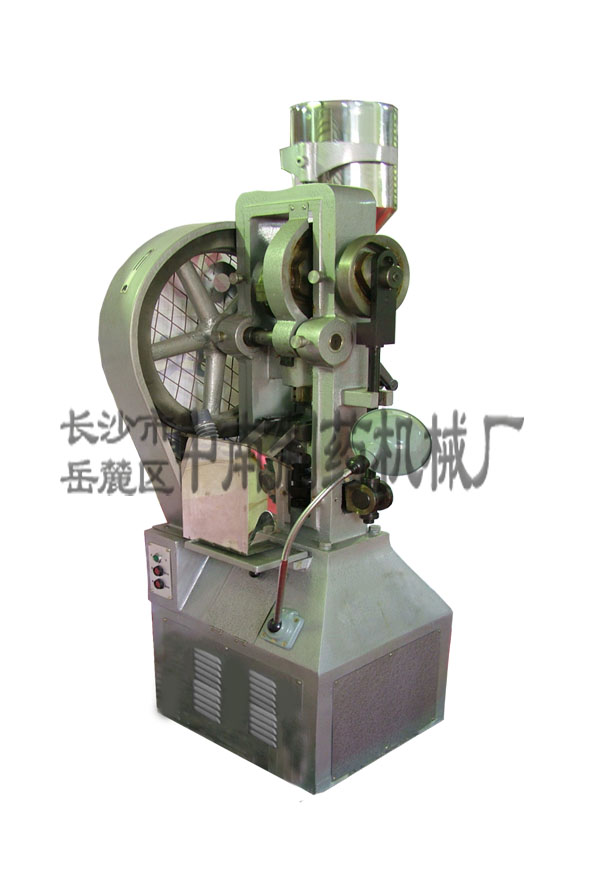 單沖壓片機是通過凸輪(或偏心輪)連桿機構(類似沖床的工作原理),使上、下沖產生相對運動而壓制藥片。單沖式并不一定只有一副沖模工作,也可以有兩副或更多,但多副沖模同時沖壓,由此引起機構的穩定性及可靠性要求嚴格,結構復雜,不多采用。單沖壓片機是間歇式生產,間歇加料,間歇出片,生產效率較低,適用于試驗室和大尺寸片劑生產。