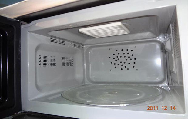 烘箱開門外貌,右側為紅外量旋鈕和微波時間控制旋鈕