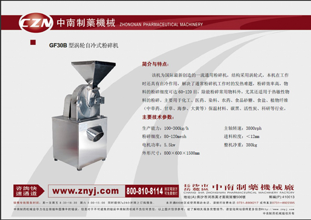 該機為新創造的通用粉碎機,結構采用渦輪式,本機在工作時還具有自冷作用,解決了通常粉碎機工作時的發熱難題,粉碎效率高,物料的粉碎細度可達60-120目,除能粉碎常用物料外,尤其還適用于熱敏性物料的粉碎。主要用于化工、醫藥、染料、農藥、食品砂糖、食鹽、植物纖維(中草藥、甘草、海參、大黃等)保溫材料、碳黑、活性炭、科研等行業。