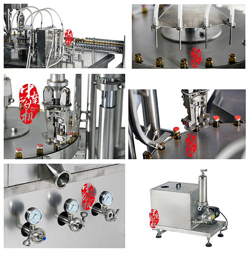 本機組為10ml-20ml口服液液體灌裝生產線中的主要設備,能自動完成口服液瓶的洗瓶、烘干、灌裝和封口等動作。