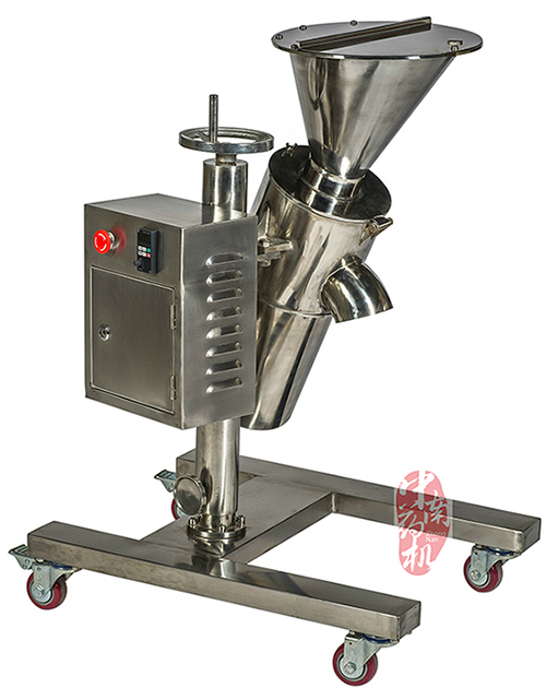 加工的原料進(jìn)入粉碎整粒機(jī)的進(jìn)料口后,落入錐形工作室,由旋轉(zhuǎn)回轉(zhuǎn)刀對原料起旋流作用,并以離心力將顆粒甩向篩網(wǎng)面,同時(shí)同于回轉(zhuǎn)刀的高速旋轉(zhuǎn)與篩網(wǎng)面產(chǎn)生剪切作用,顆粒在旋轉(zhuǎn)刀與篩網(wǎng)間被粉碎成小顆粒并經(jīng)篩網(wǎng)排出。粉碎的顆粒大小,由篩網(wǎng)的數(shù)目、回轉(zhuǎn)刀與篩網(wǎng)之間的間距以及回轉(zhuǎn)轉(zhuǎn)速的快慢來調(diào)節(jié)。