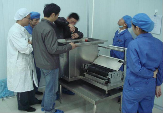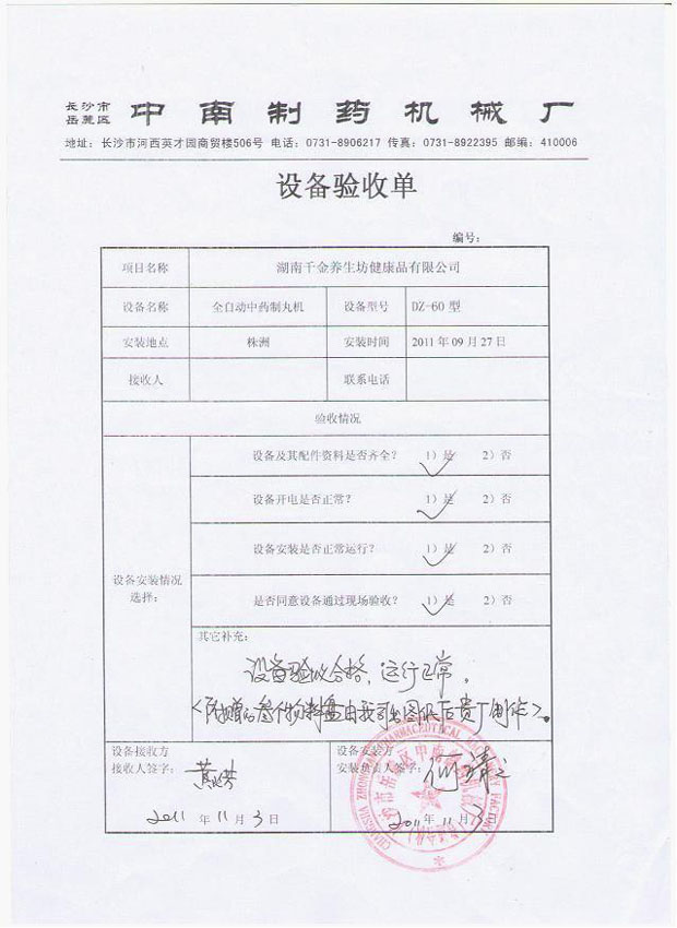 2011年10月,湖南株洲千金養生坊健康品有限公司向我廠購買了DZ-60型全自動制丸機、ZKB-K型顆粒包裝機、LM型煉蜜機、RXH-48盤熱循環烘箱、KZ-180型快速整粒機、CH-200型混合機、YK-160型重型顆粒機、GF-30B型帶除塵渦輪自冷式粉碎機組等設備。現已投入使用。