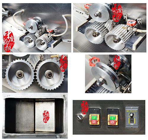 我廠生產的DZ-60型全自動制丸機,主要技術特點有兩點:一是混合物料進入工作腔后,特制螺桿可以將物料再一次擠揉,使從工作腔出來的物料成條形狀好,干濕度、粘稠度合適,便入下一步制丸,如物料出條不,還可以多次擠揉,達到程度。二是制丸成型滾輪可精細調節,便于下條順利和成型美觀。